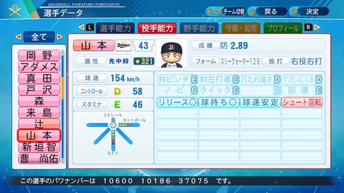 2018年成績 54試合 4勝 2敗 1セーブ 32ホールド 防御率2.89 先発ローテを争うものの、4月半ばにリリーフで昇格。後半は離脱も目立ったが54試合に登板するなど飛躍のシーズンになる 査定のあれこれ ドロップカーブを削除。 対ピンチ、対左を調整 球持ち◯を追加
