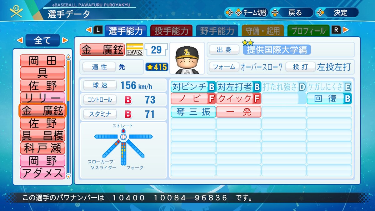 2020-07-13 金廣鉉(2019年SKワイバーンズ)(メジャーリーグ現役選手) KBO選手 パワプロ2020再現選手 パワプロ2020 19年はフル回転、微笑みサウスポー完全復活 というわけで金廣鉉の19年です 成績 防御率2.51 31試合 17勝 6敗 180奪三振 では能力 査定のあれこれ ノビF………打低年にも関わらず被打率3割、ops.8と大惨事、直球割合も40%を切る 変化球………いつものVスラ、カーブに加え新たにフォークを使用、被打率2割を切る武器の一つに 一発……毎年多い上この年も13本と多め。 クイック……いつもの、そんなに得意じゃない 回復B……30試合に先発登板 その他 メジャーでも頑張れ
